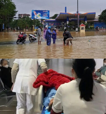 Giữa ngã tư Hùng Vương mênh mông nước, người cha quỳ gối, ôm chặt lấy...