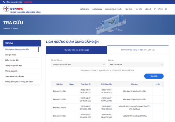 | Điện lực Kinh Bắc | 2026-04-07 09:45:00.000 | 2026-04-07 11:45:00.000 | Một phần KH phường Vũ Ninh (TBA T2 – TD B.Kim Đôi 2) | ||